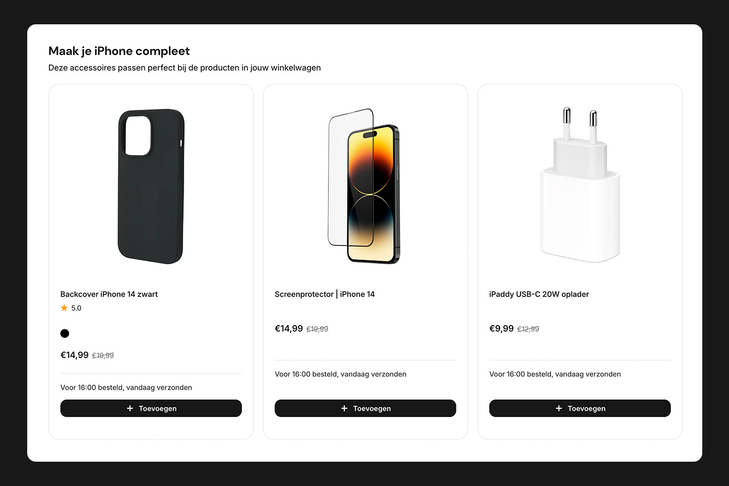 In de cart toont het systeem automatisch compatibele accessoires. Koop je een iPad Pro? Dan zie je de juiste Apple Pencil en het bijpassende toetsenbord. Niet random 'anderen kochten ook', maar écht relevante producten. Dit verhoogde de orderwaarde van €230 naar €270.