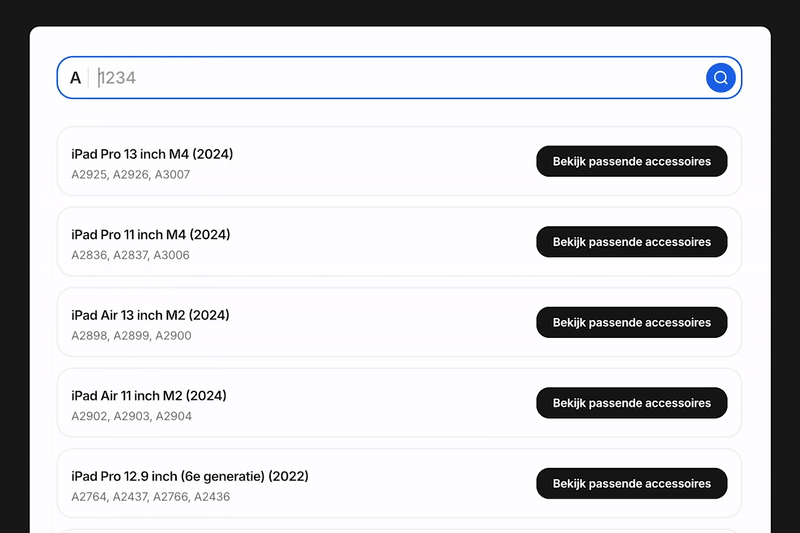We maakten een custom 'Welke iPad heb ik' tool die op modelnummer zoekt. Perfect voor mensen op zoek naar accessoires die niet weten welk model iPad ze hebben. Deze tool rankt goed in Google.